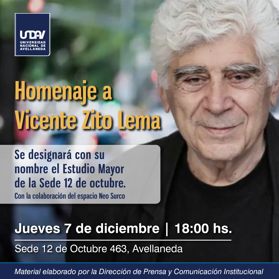 Compartimos la entrevista realizada en Hacemos PyE a Rodolfo Hamawi, secretario de Cultura y Producciones Audiovisuales de la UNDAV. Conversamos sobre el reconocimiento de la UNDAV a través de la Resolución de Consejo Superior N° 565/2023, designará con el nombre "Dr. Vicente Zito Lema" al Estudio N°1 de la Sede 12 de Octubre en donde se dicta la carrera de Artes Audiovisuales. El acto se llevará a cabo el jueves 7 de diciembre, a las 18 horas, en la sede ubicada en 12 de octubre 463, Avellaneda.