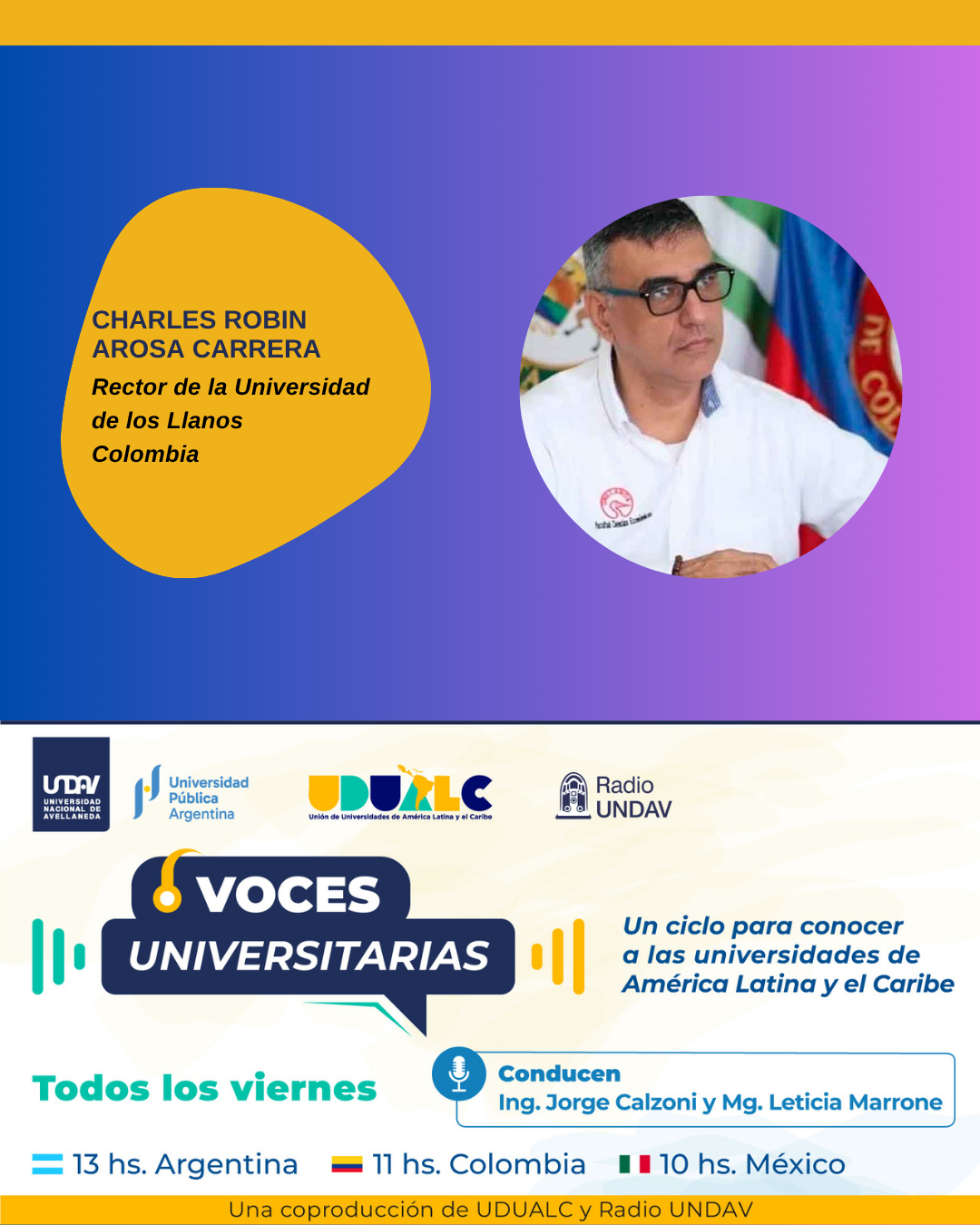 En esta oportunidad entrevistamos a Charles Robin Arosa Carrera, rector de la Universidad de los Llanos, Colombia. En la misma dialogó acerca de los desafíos del sistema universitario  y el rol de la UDUALC en la generación de proyectos entre distintos países de la región.